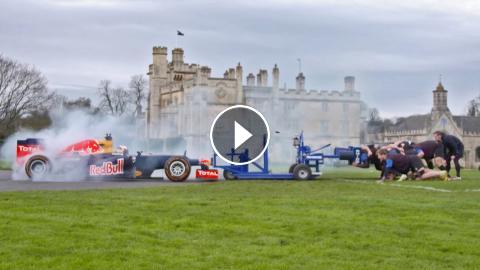 An F1 race car versus eight rugby players.